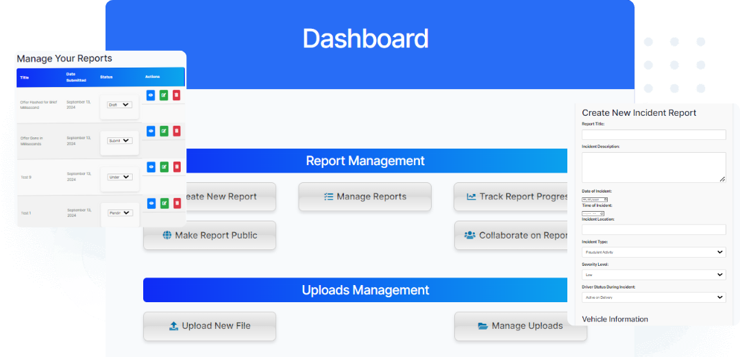 After creating a free account on Driver Watchdog, you can log into your personal dashboard. From there, you can create new reports by providing details such as the time, driver information, and description of the incident. All your reports are saved in your dashboard, where you can update, manage, and track multiple incidents over time.